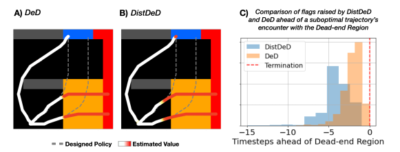 Empirical evidence that DistDeD enables an earlier determination of high-risk areas of the state space on both a simulated environment and a real-world application.